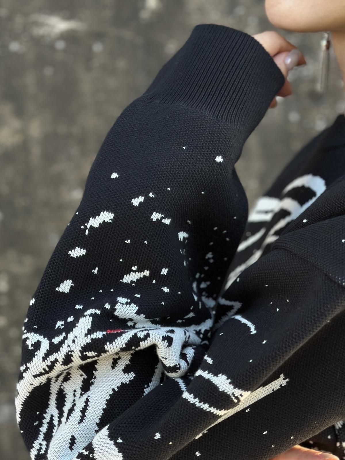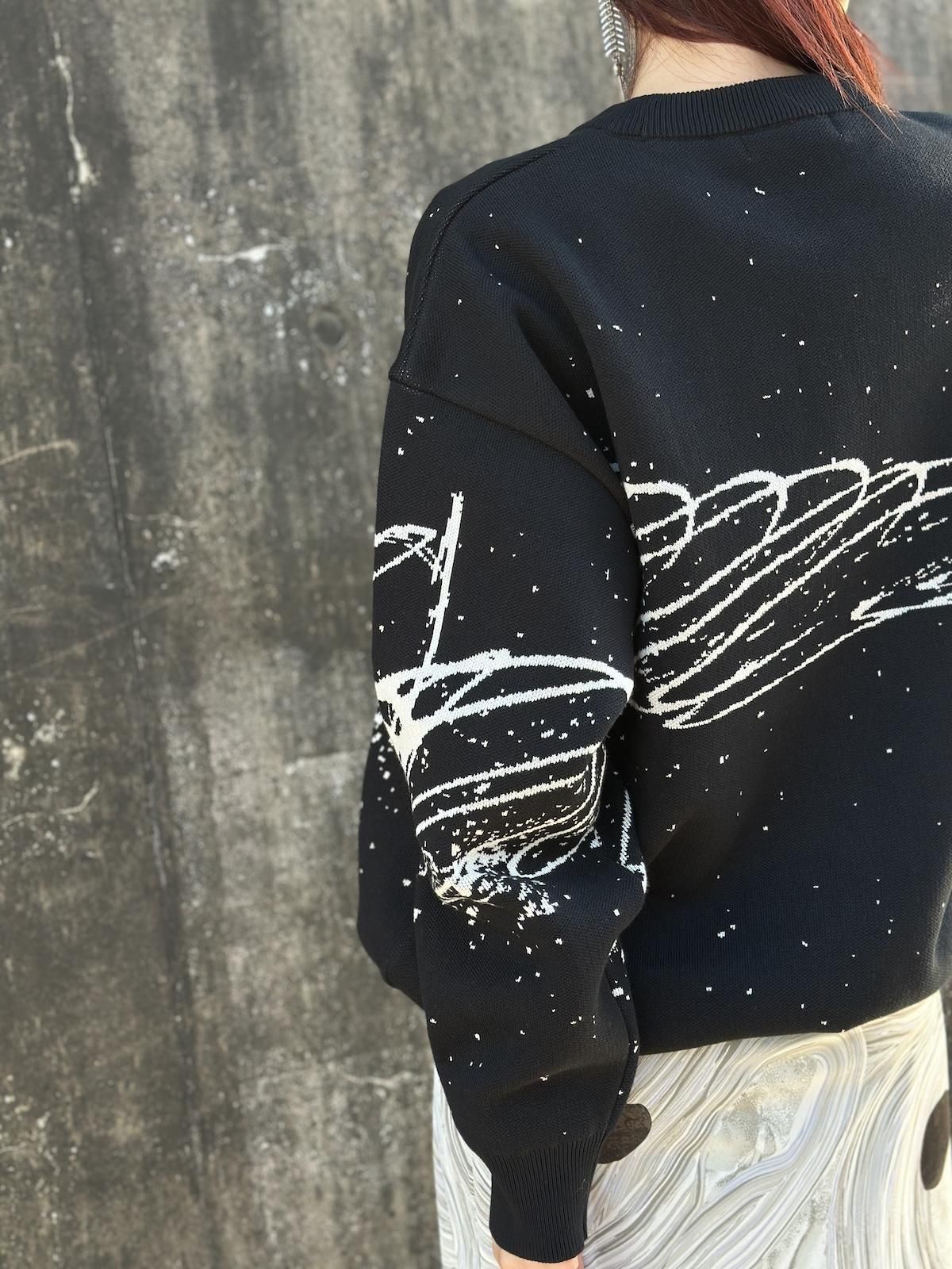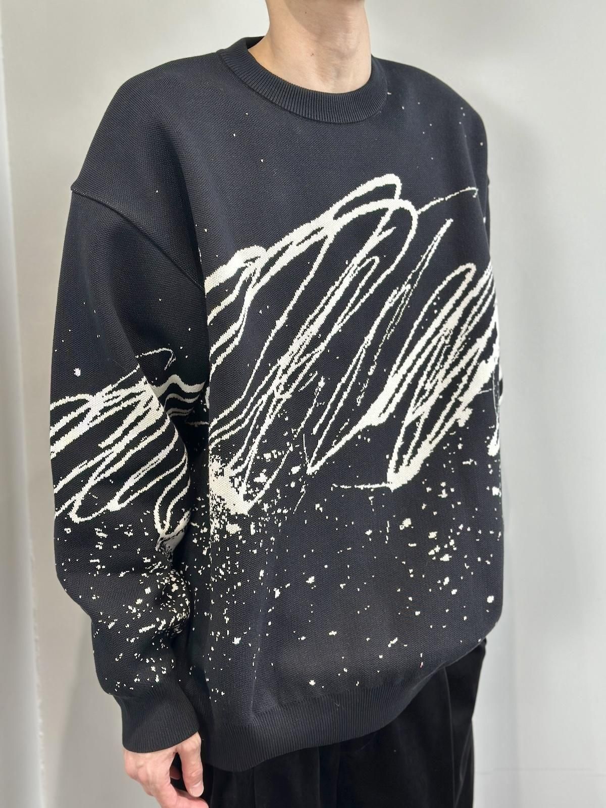 "textileとtextの語源は同じ" というところから着想を得て描かれたドローイングのコットンニットです。